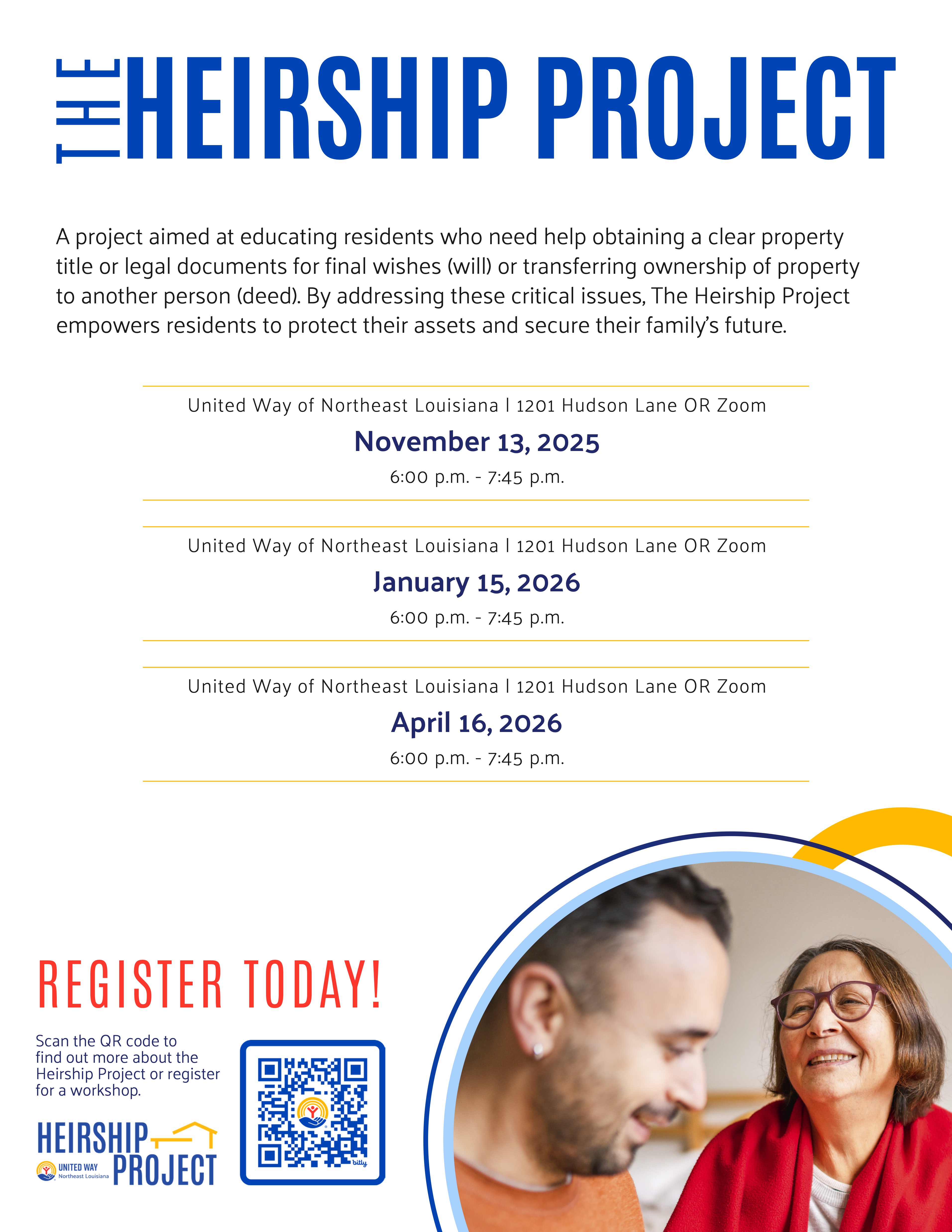 United Way of Northeast Louisiana (UWNELA), in partnership with the Northeast Louisiana Bar Foundation, is proud to continue The Heirship Project, an ongoing initiative addressing the challenges of heir property and succession issues that impact families across Northeast Louisiana.The 2025-26 Heirship Project will feature free community workshops and attorney Lunch & Learn sessions, providing both ...read more